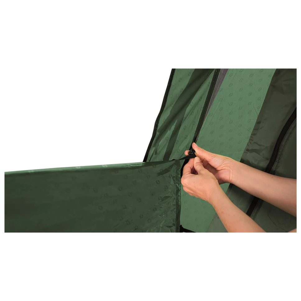 La tente possède un vestibule spacieux qui peut être utilisé comme zone pour manger ou pour se détendre. On y est à l’abri de la pluie et des rayons du soleil. La tente est donc vraiment confortable. La sécurité est assurée par les arceaux robustes et les haubans. En cas de fortes rafales, on peut monter la corde anti-tempête supplémentaire. Elle répartit les forces de manière homogène sur l’ensemble de la construction afin qu’elle tienne solidement. L’Oakwood est idéale pour le camping !