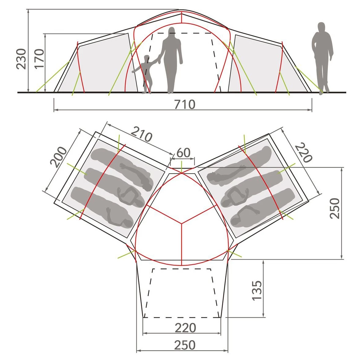 Pour monter la grande tente, vous avez besoin d’une surface assez grande : la tente mesure 710 cm de long. Avec l’espace pour les haubans, l’emplacement de la tente doit donc mesurer au moins 10 m de long. Avec 230 cm de hauteur au milieu, la tente Vaude offre une excellente libertĂ© de mouvement et une hauteur agrĂ©able pour les personnes de très grande taille. MĂŞme au niveau des entrĂ©es des chambres, la Badawi Long 6P a une hauteur agrĂ©able de 170 cm.