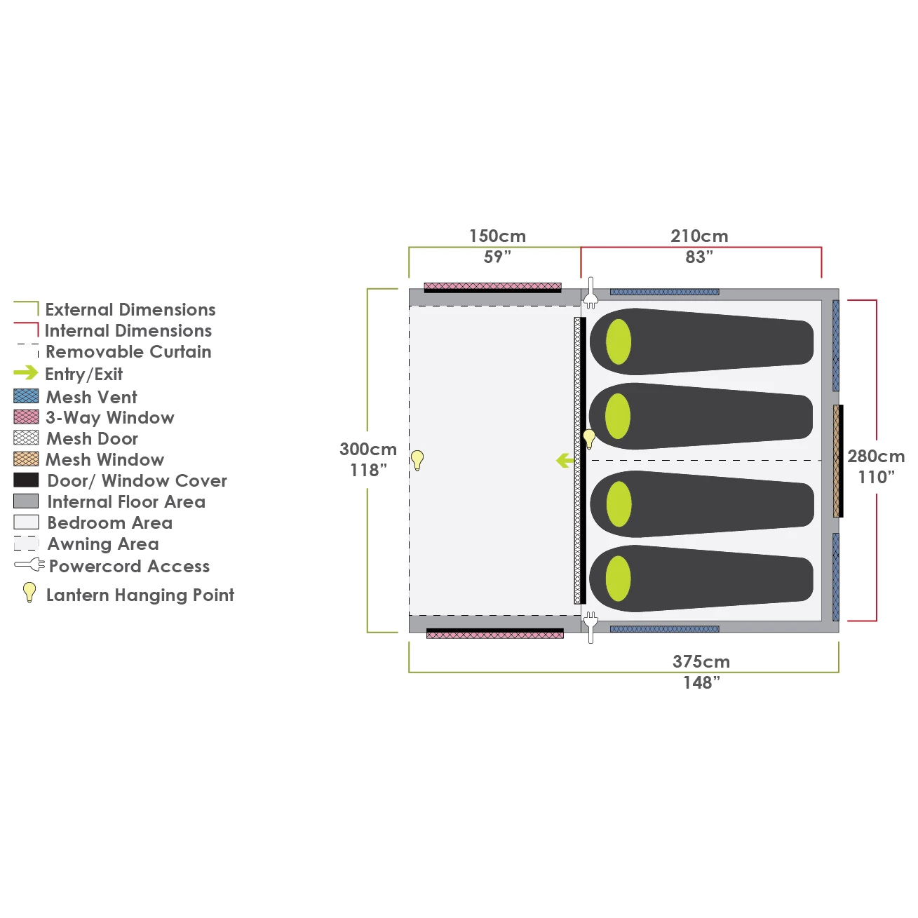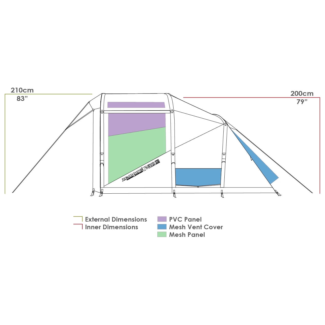 La tente possède un espace de couchage, un espace de vie et un espace extérieur couvert. La grande entrée permet d’entrer et de sortir facilement et se retire entièrement pendant la journée pour aérer. La zone de couchage a la taille parfaite pour trois ou quatre personnes et peut être divisée en deux cabines séparées par un rideau. La fenêtre d’aération de la zone de couchage et le tissu occultant et respirant garantissent des conditions de sommeil optimales, même lorsqu’il fait chaud. L’auvent protégé des intempéries est équipé de fenêtres en PVC teinté et invite à prendre un repas et à se détendre. L’auvent peut être équipé d’une paroi Evo Wall Set ou être complété par un pavillon Aerobase pour créer un espace de vie supplémentaire. Avec la tente Evo TS de Zempire, chaque voyage en camping sera un succès !